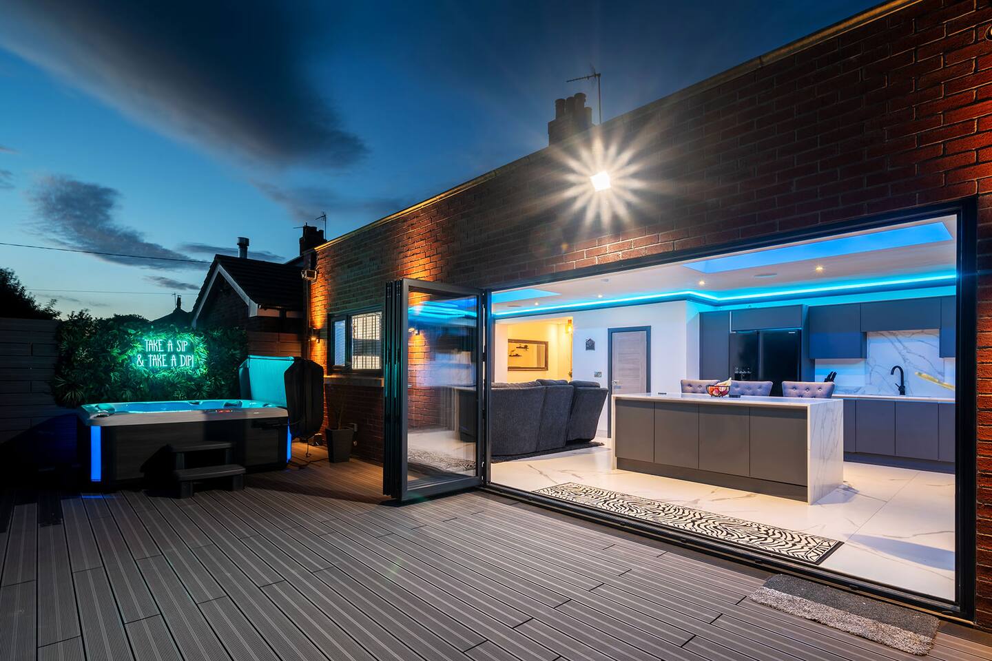 🏡 Family Home with Hot Tub & Garden – Mumby, Lincolnshire Comfy 4-bed home in Mumby with tiled floors, LED lights, TVs in every room, Wi-Fi, and a big kitchen with skylights and island. Bifold doors open onto decking with glass balustrade overlooking the garden and fields — stunning at sunrise and sunset. Enjoy the hot tub, BBQ area, kids’ play space, and pool table in the garage. Near farms, walks, garden centres, and adventure parks. Skegness and Ingoldmells just 15 mins away.